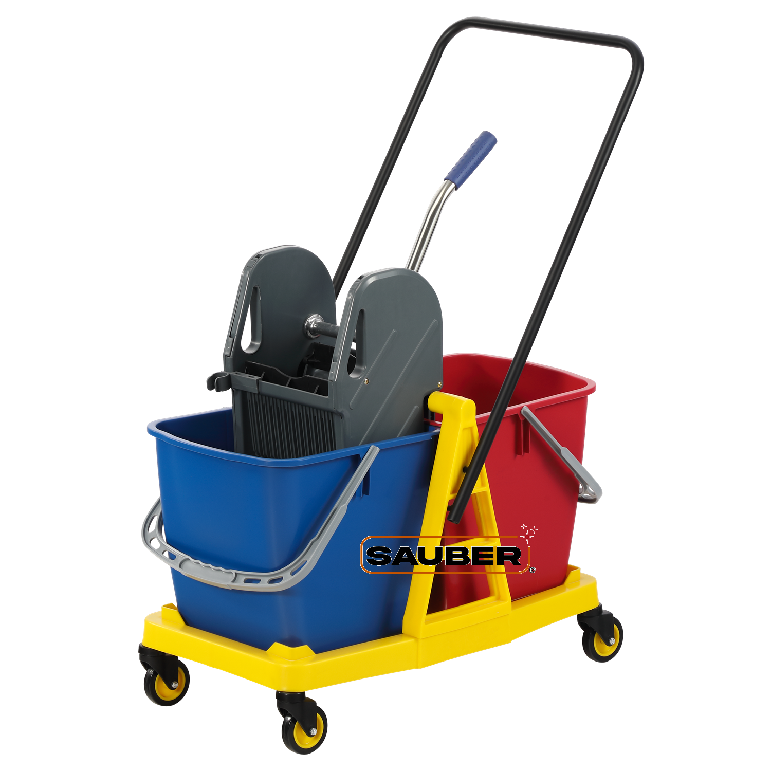 Carro estrujador para el estrujado de mopas sin necesidad de utilizar las manos gracias a su sistema de estrujado por prensa. Hecho en plástico industrial de alta resistencia.