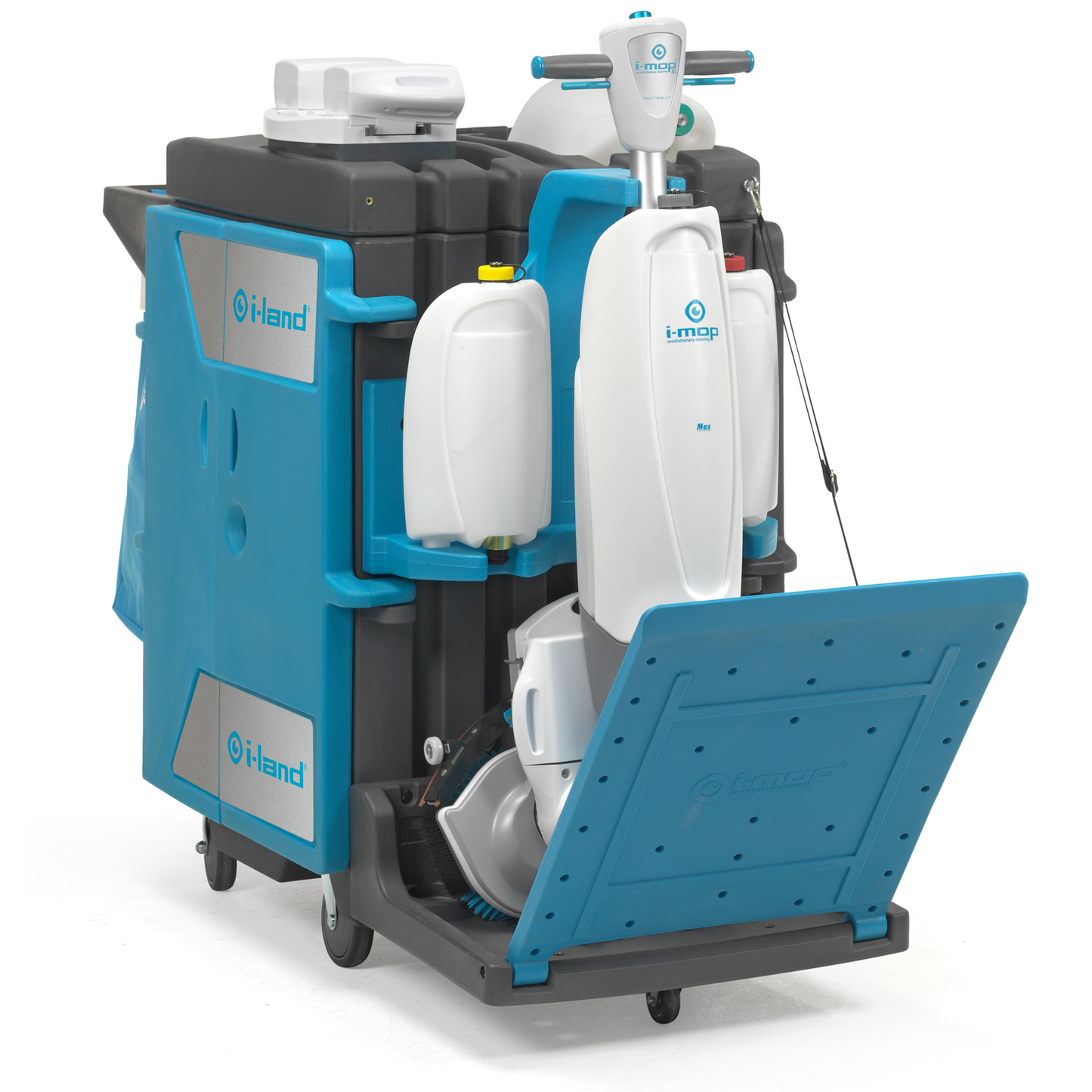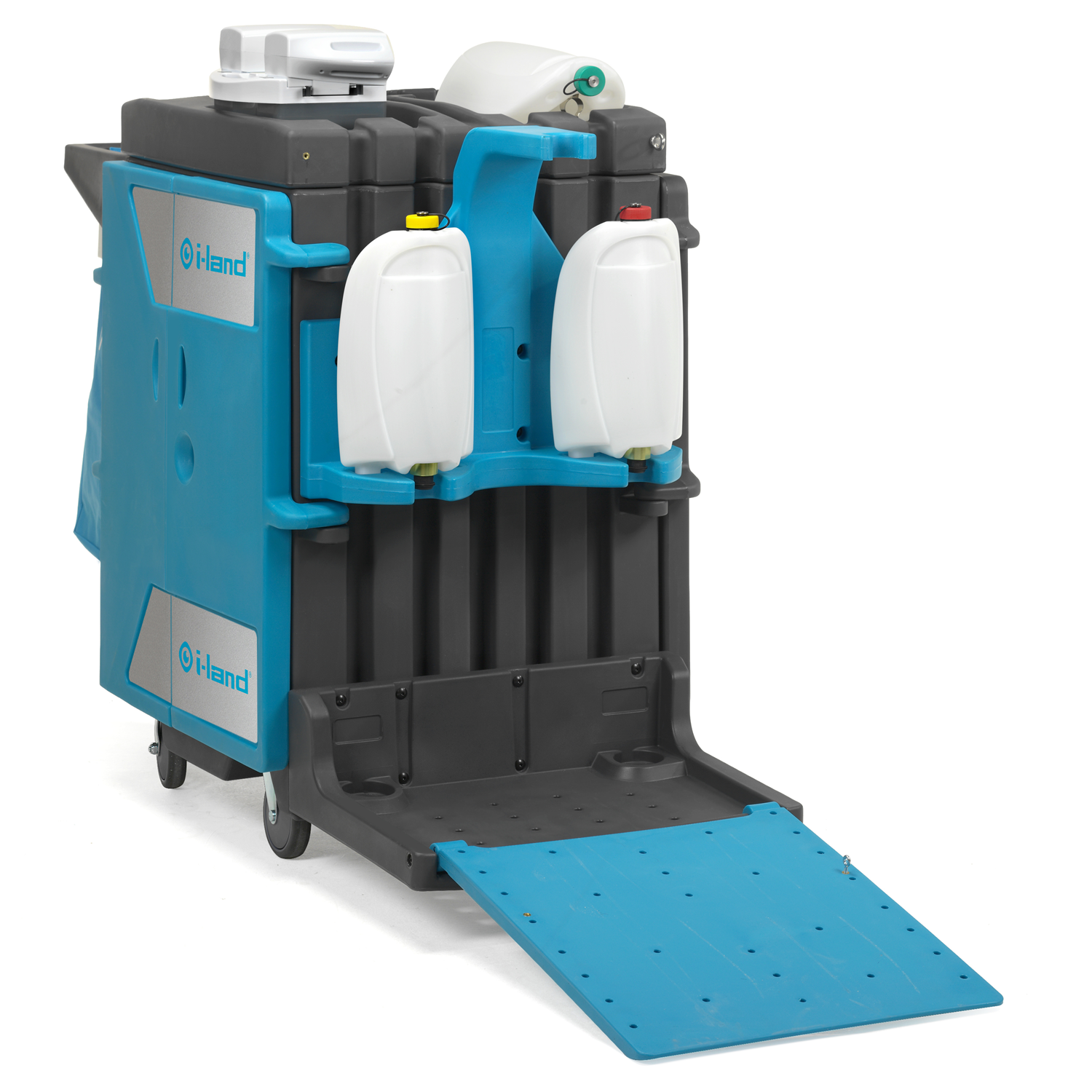 Carro especialmente diseñado para llevar vacuolavadoras verticales necesarios para realizar el aseo en forma profesional y con un alto estándar de higiene.