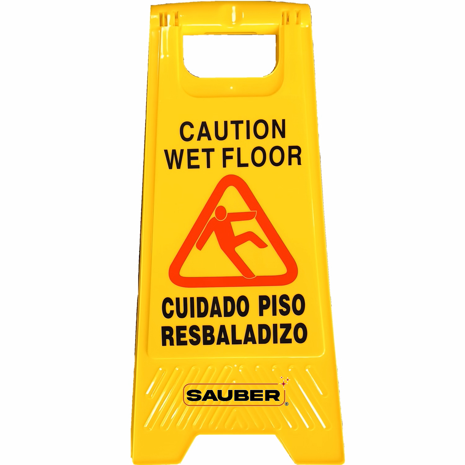 Señalética plástica de color amarillo resistente a golpes con leyenda de advertencia de piso mojado, para ser usada en pisos humedos u otras condiciones de riesgo
