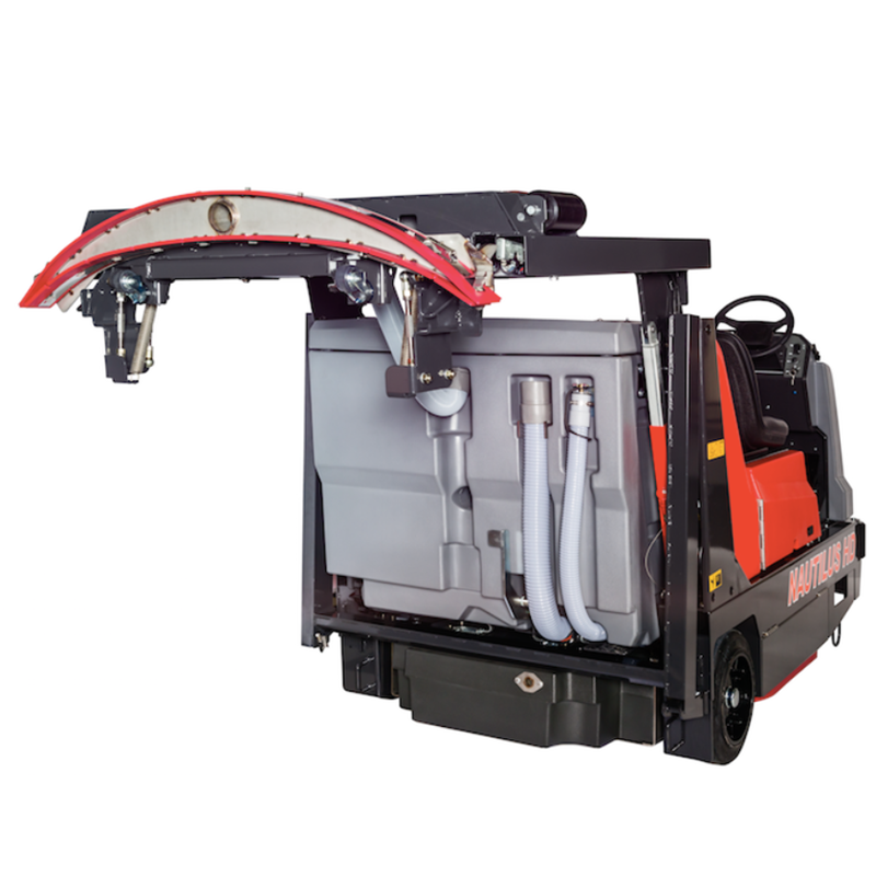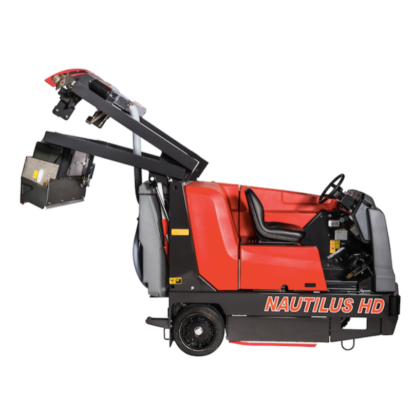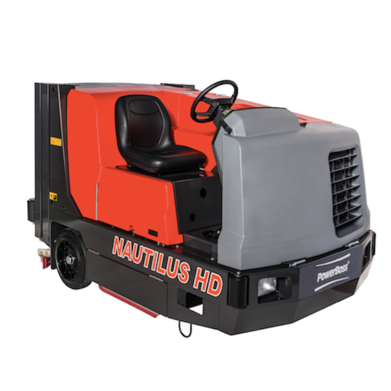 Vaculavadora/Barredora combianada POWERBOSS NAUTILUS. Americana hombre a bordo en versiones Diesel, LPG gas y Gasolina para uso industrial con presión regulable en los cepillos. Chasis de acero. Ancho de trabajo 152 cm. Estanque con capacidad de 398 lt de agua. Rendimiento 12.750 m2 hora. Ruedas anti-deslizantes. Bastidor de acero con protección a la corrosión.